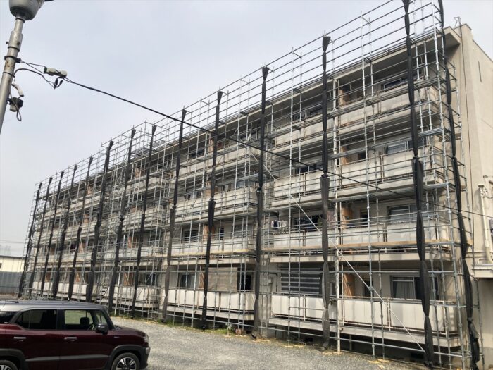 現在、足場の組み立てとメッシュシート張りが行われております。