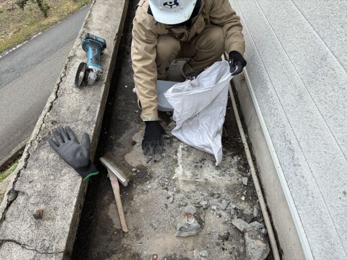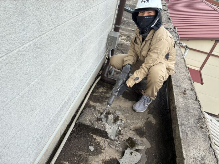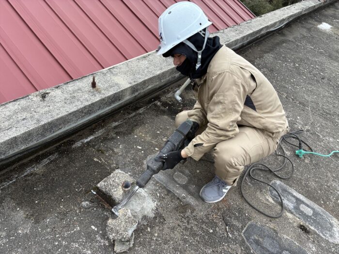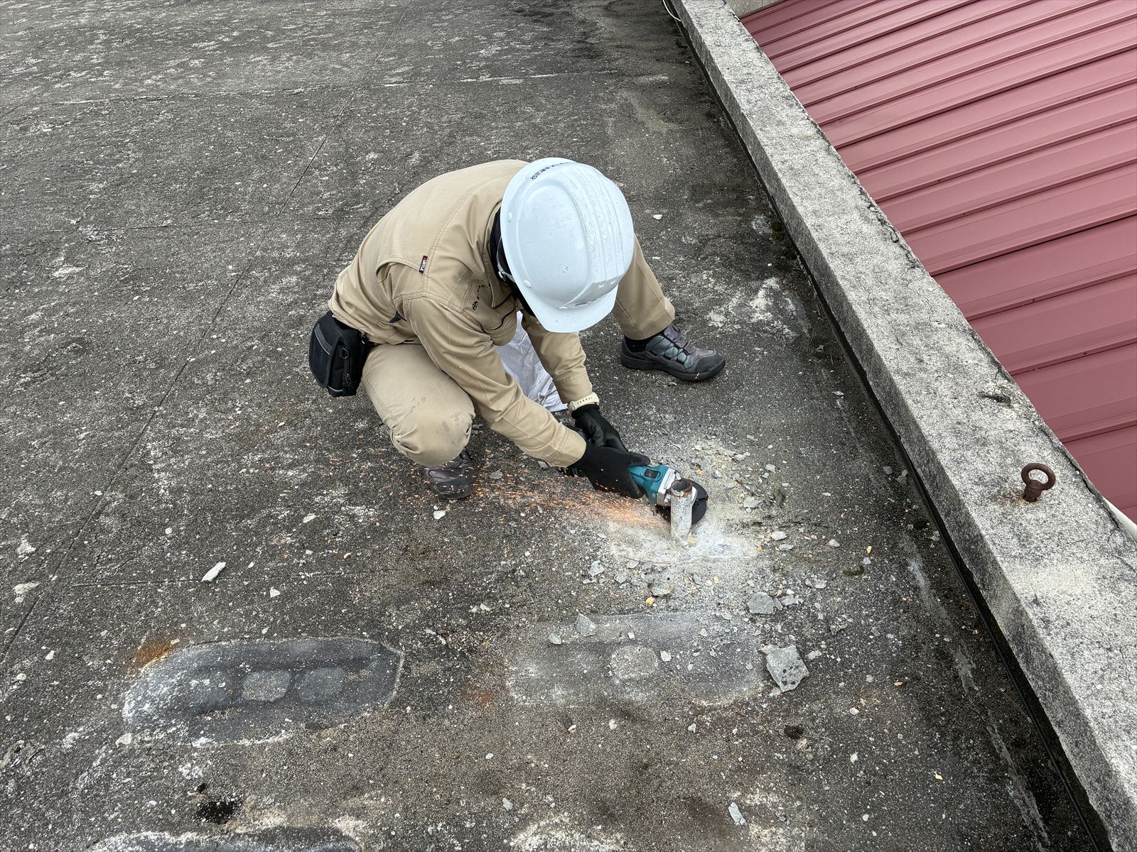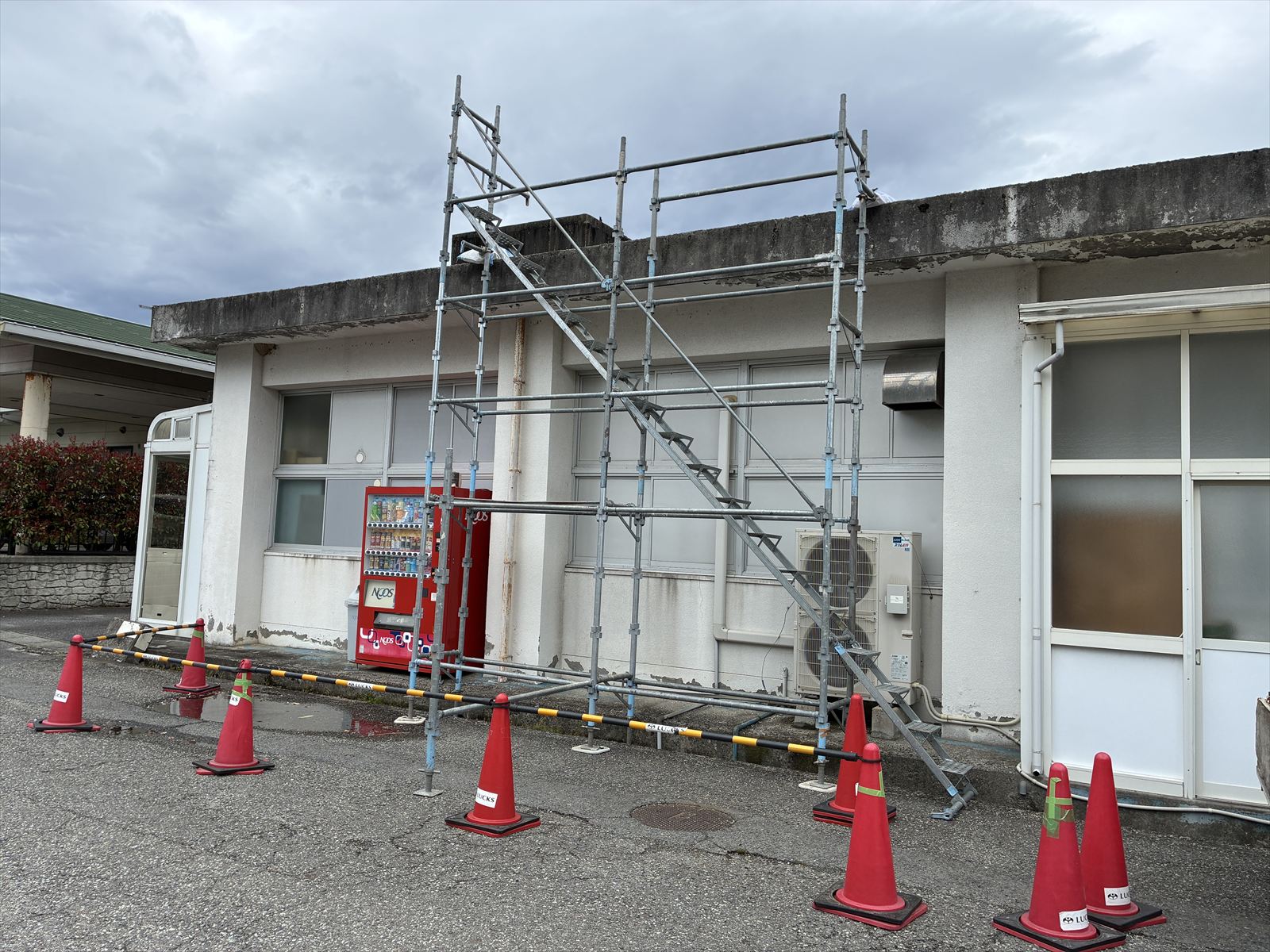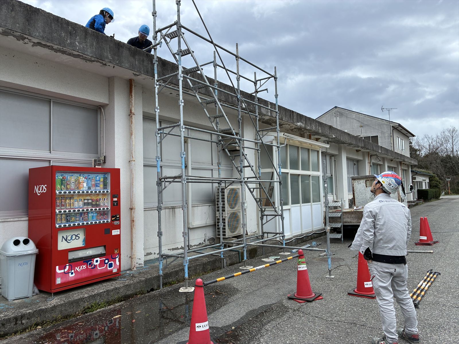 先週の土曜日、加藤とアインが島根県の現場を再訪し、足場組みと防水の邪魔になるものなどのハツリを行ったそうです。
