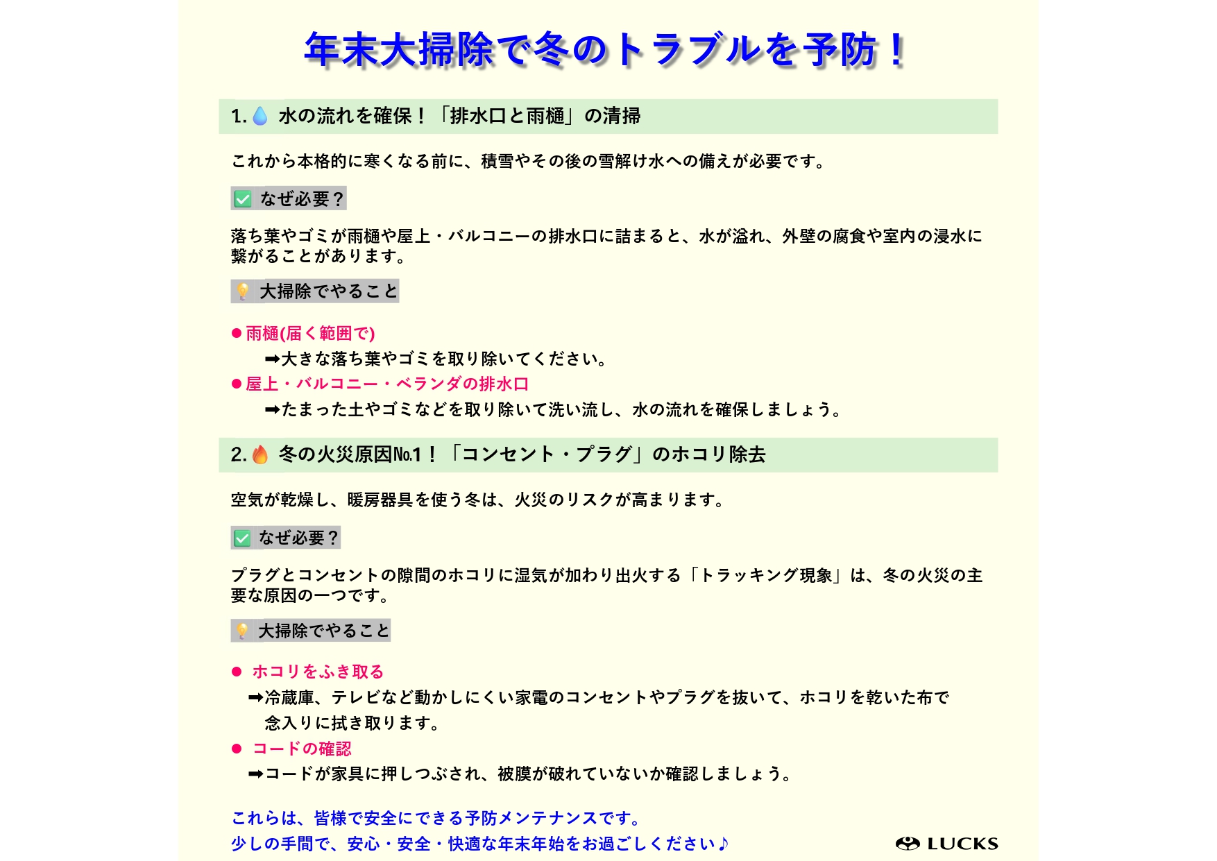その大掃除のついでに、事故やトラブルを未然に防ぐためのチェックを行いましょう!