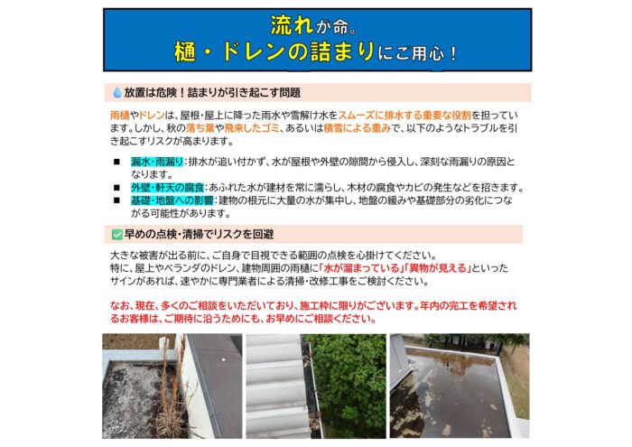 みなさんがお持ちの建物の樋やドレン、詰まっていませんか?